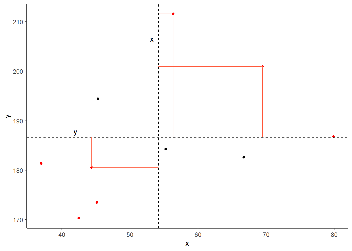 In fact, for all these points in red, the product \((x_{i}-\bar{x})(y_{i}-\bar{y})\) is positive (remember that a negative multiplied by a negative gives a positive):