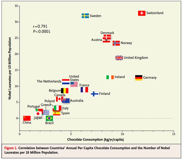 An often cited paper which appears to fall foul of this error took a correlation between a country’s chocolate consumption and its number of nobel prize winners (see Figure 4) to suggest a causal relationship between the two (“chocolate intake provides the abundant fertile ground needed for the sprouting of Nobel laureates”):