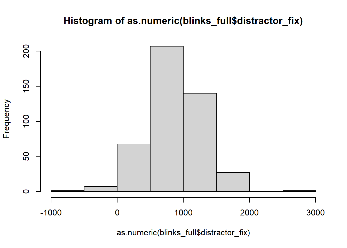 So where are we now? We have a dataset that has one row per trial per subject, and it contains information on the number of blinks, and on the time spent looking at the distractor: