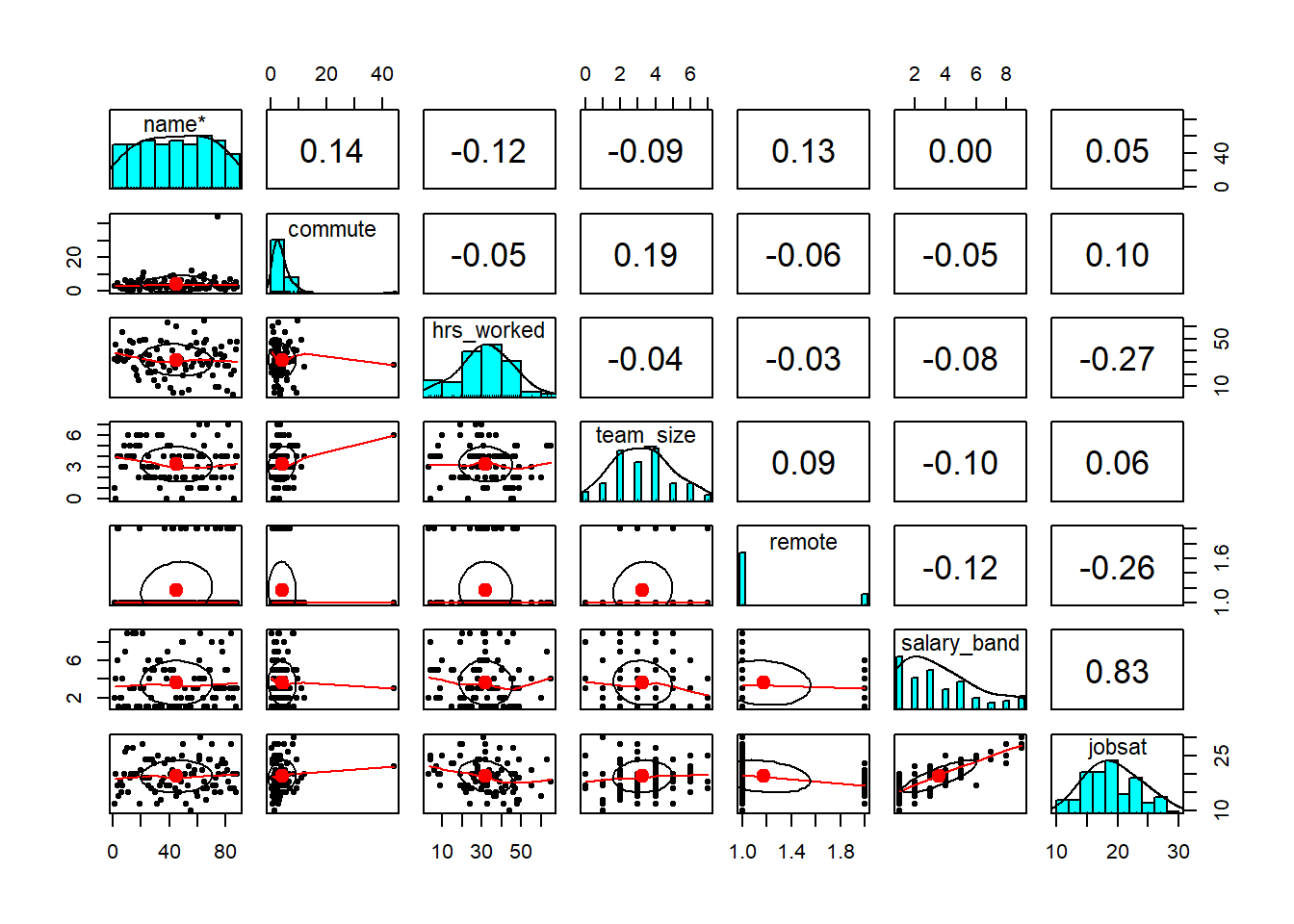 A company is worried about employee turnover, and they are trying to figure out what are the main aspects of work life that predict their employees’ job satisfaction. 86 of their employees complete a questionnaire that leads to a ‘job satisfaction score’, that can range between 6 to 30 (higher scores indicate more satisfaction).