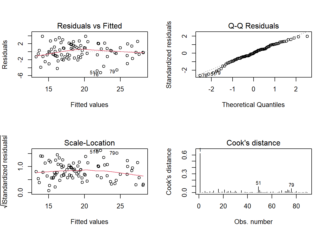 Check the assumption plots from the model. Remember we had that employee who was commuting quite far - are they exerting too much influence on our model?