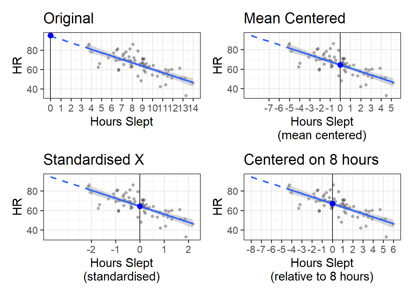 mod_orig <-lm(HR ~ hrs_sleep, data = hrdat)mod_mc <-lm(HR ~scale(hrs_sleep, scale=FALSE), data = hrdat)mod_z <-lm(HR ~scale(hrs_sleep), data = hrdat)mod_8 <-lm(HR ~I(hrs_sleep-8), data = hrdat)anova(mod_orig, mod_mc, mod_z, mod_8)