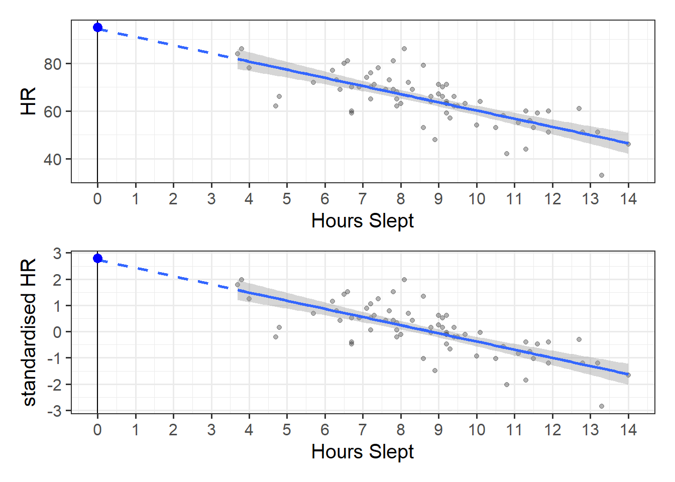 Standardised coefficients lm(HR ~ scale(hrs_sleep), data = hrdat)