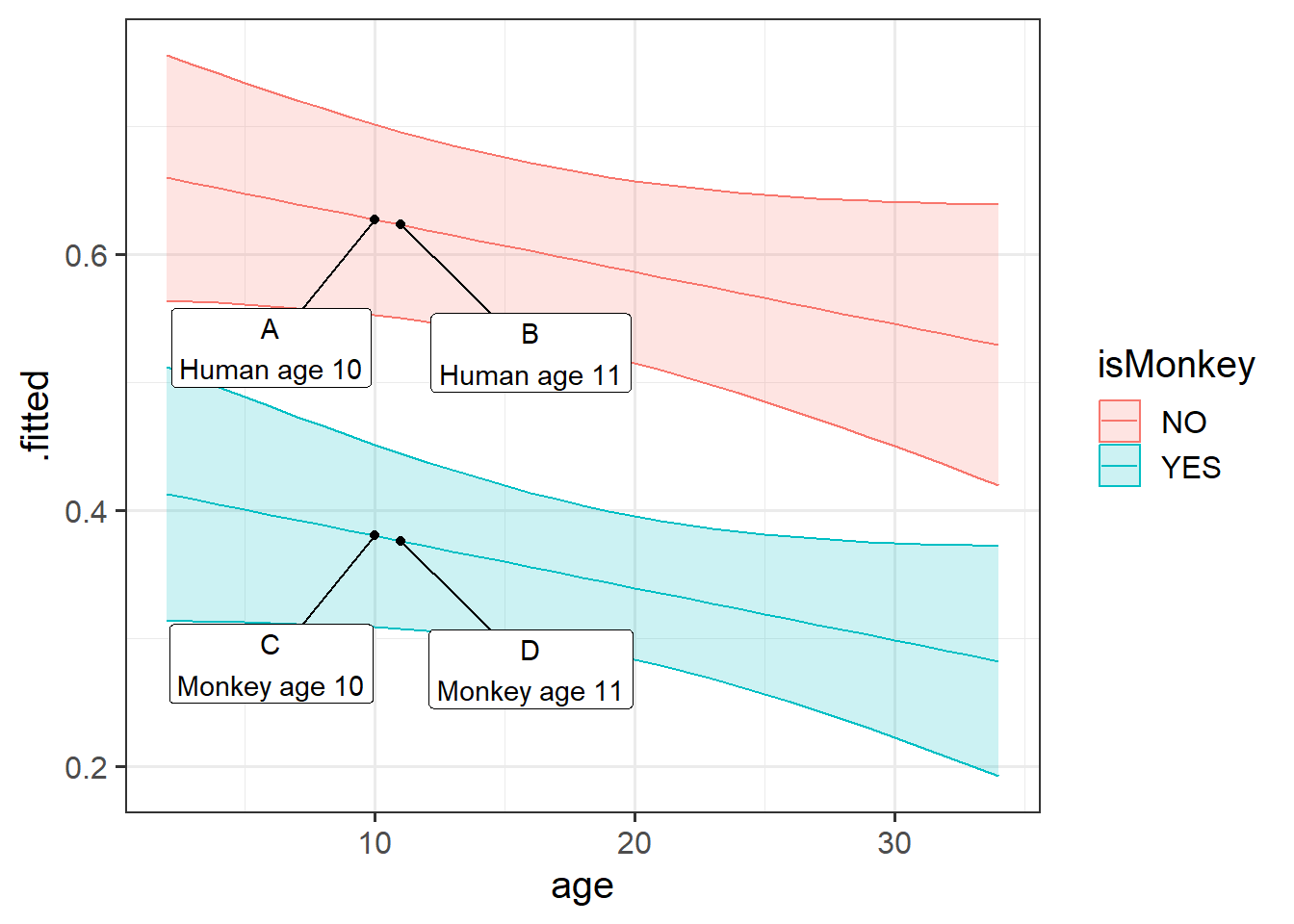 The idea of this can be seen on the plot in Figure 1. Imagine 4 different participants in our data. The coefficient for isMonkeyYES is the difference between A and C, or the difference between B and D. It doesn’t matter where on the x-axis we go, it is the vertical distance between the two lines.
