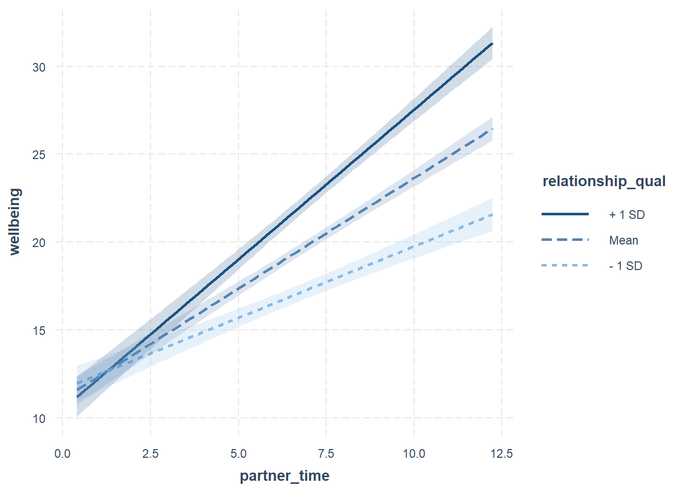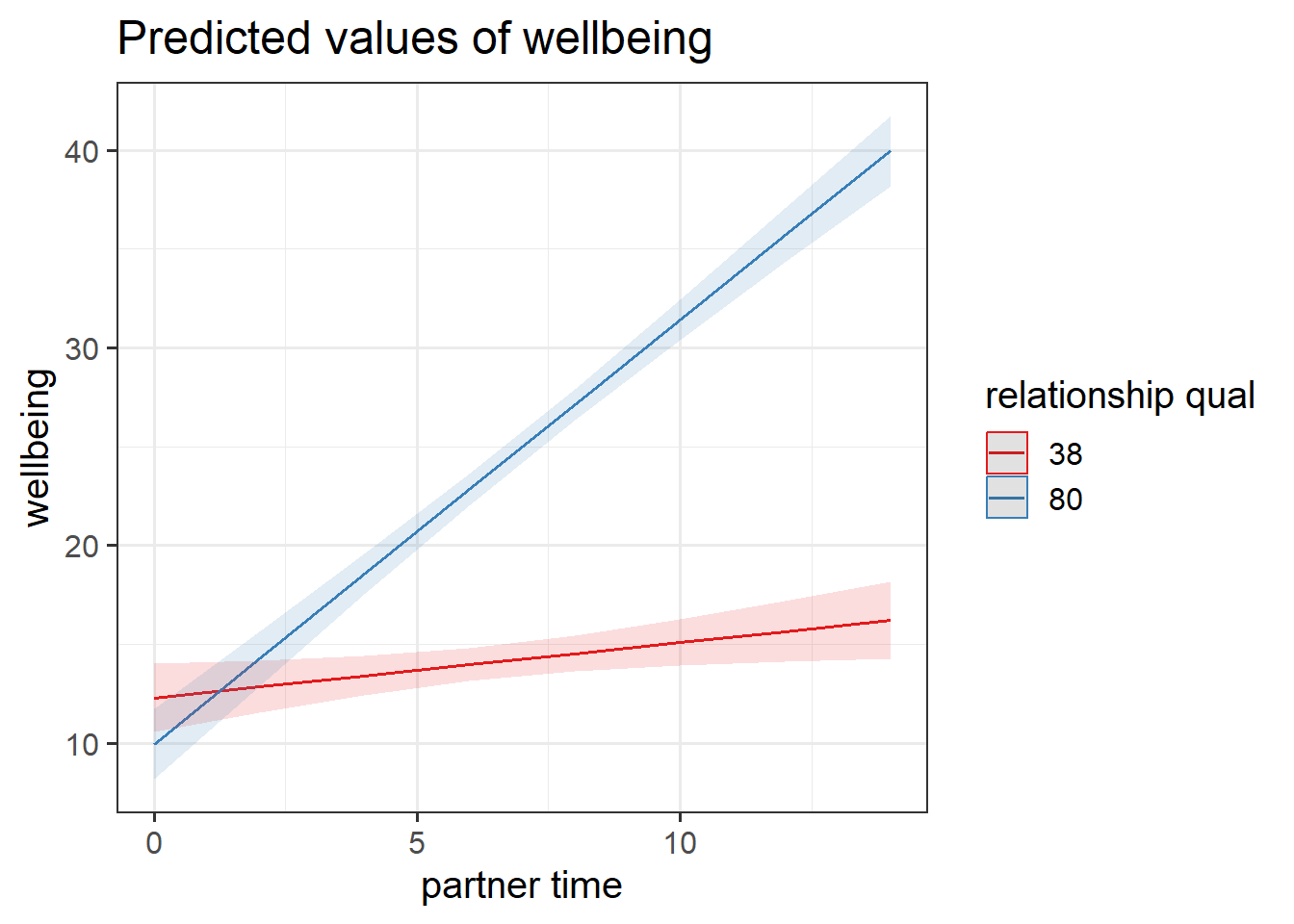 And we can phrase this the other way around: at high amounts of time spent with partner, relationship quality has a bigger effect on wellbeing than it does for low amounts of time spent.