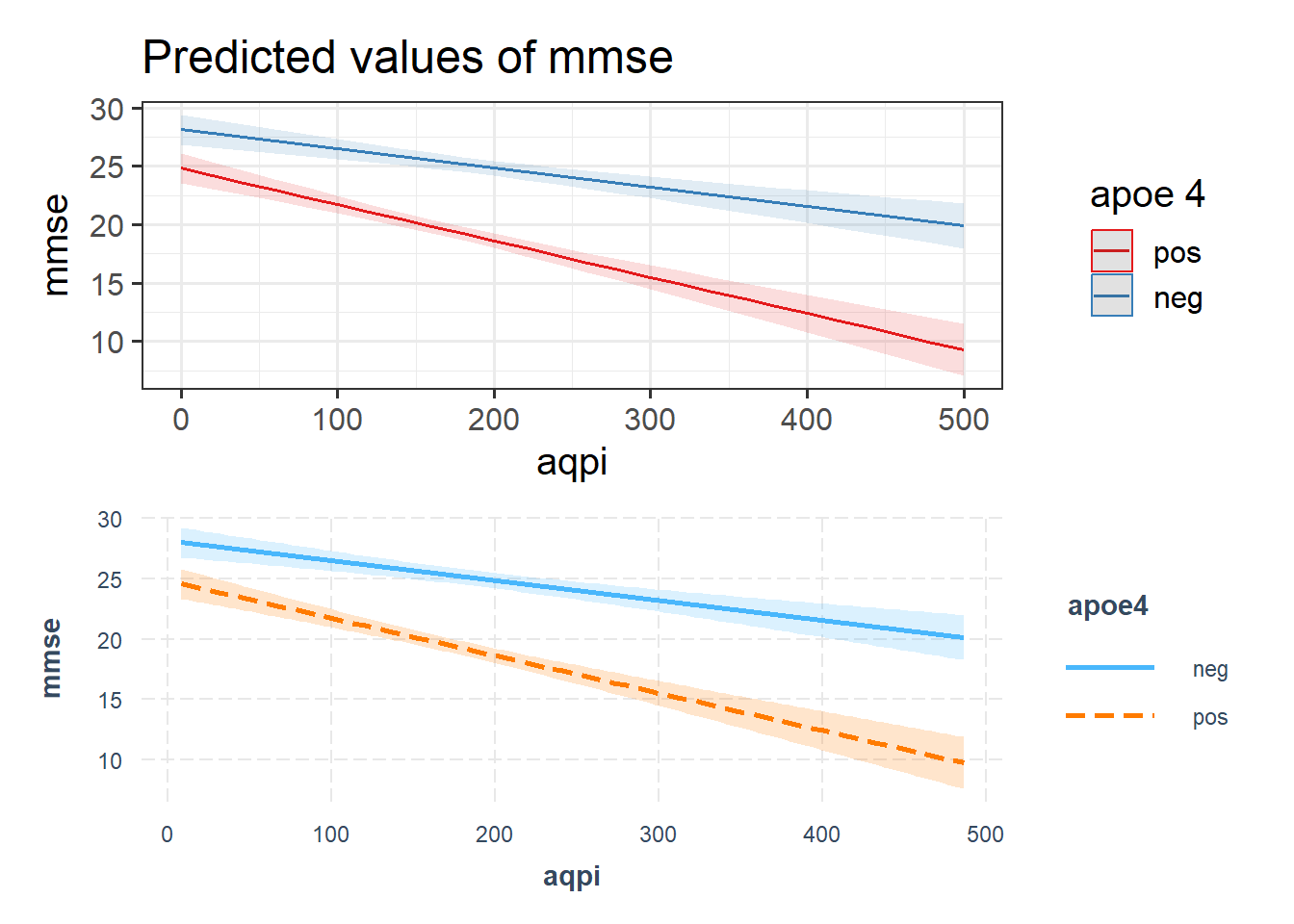 eg2mod_cent <- lm(mmse ~ scale(aqpi,scale=FALSE) * apoe4, data = airpol)# coefficients: