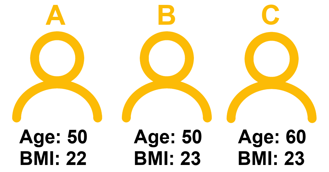 The difference in model estimated Score between Person A and Person B is the coefficient of BMI, because those two people only differ on BMI. Person A and Person C also differ on age. This is how the coefficient of BMI is interpreted as “holding age constant” - it is a comparison between two hypothetical people who differ on BMI but are identical with respect to the other predictors in the model.