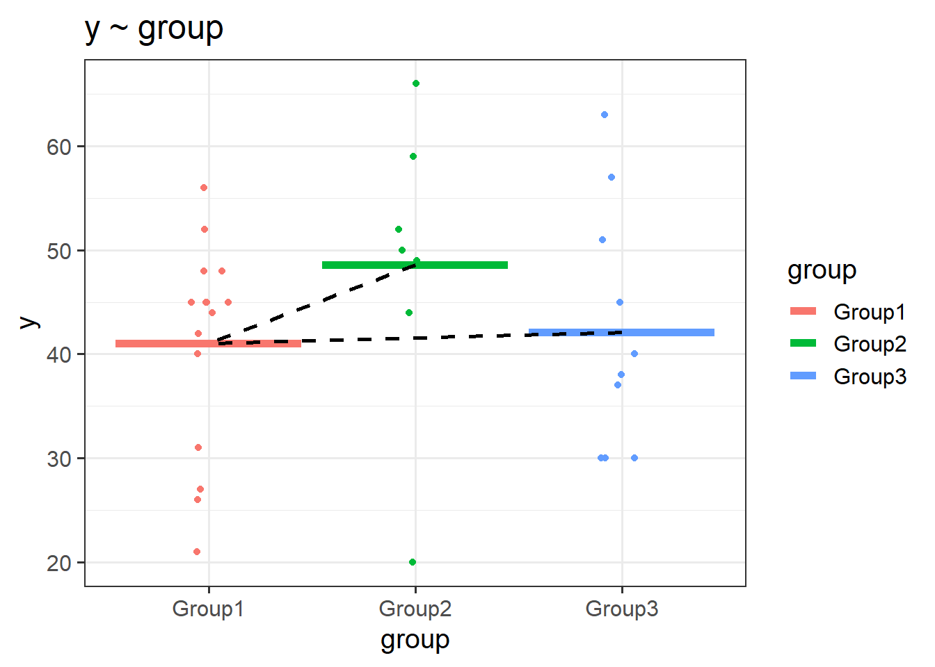 In the plots below, if “Group1” is the reference, then the coefficient groupGroup2 would represent the vertical distance from the red line to the green line, and the coefficient groupGroup3 would be the vertical distance from the red line to the blue line.