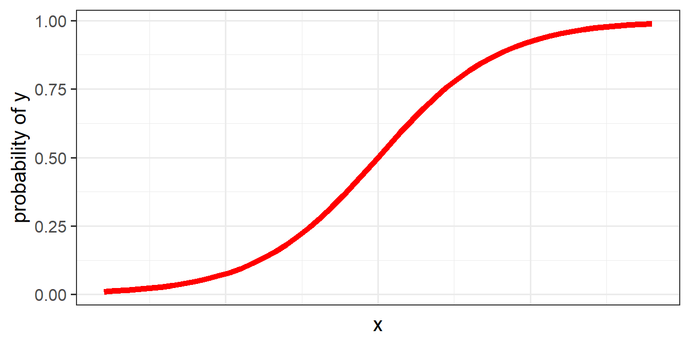 The problem, fundamentally, is that things like probability is not linear. We think of it as getting ever and ever closer, but never reaching, 0 and 1. For instance, if the probability of \(y\) ocurring increases with \(x\), it makes most sense to think of it looking something like Figure 8.