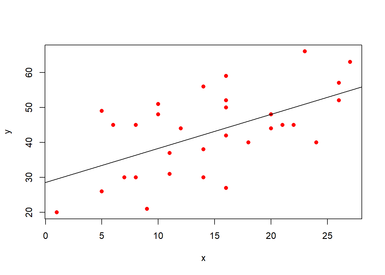 - \(\varepsilon\): the “Residuals” or “Error term”. These are the distances from each of our observed values to the model predicted values. In the plot below, these are the vertical distances from each red dot to the black line. The standard deviation of all these gets denoted \(\sigma_\varepsilon\).