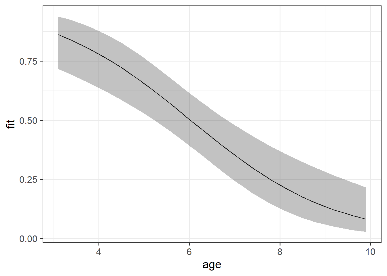 ggplot(aes(x=age,y=fit,ymin=lower,ymax=upper))+