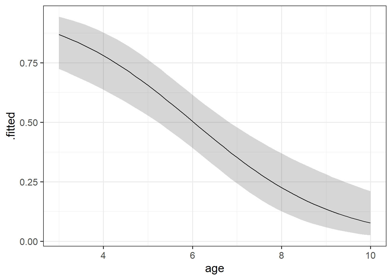 augment() can get us some of the way there. We can get out fitted values (on whatever scale we want, either “link” - the log-odds, or “response” - the probabilities), and we can get out standard errors (on that same scale)