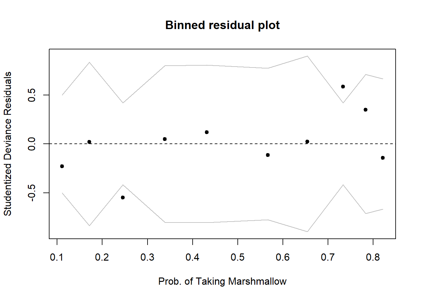 Sometimes a binned plot6 can be more informative, but not always! It works by combining together all responses for people having the same covariate \(x_i\) value, and taking the average studentized Pearson residual for those.