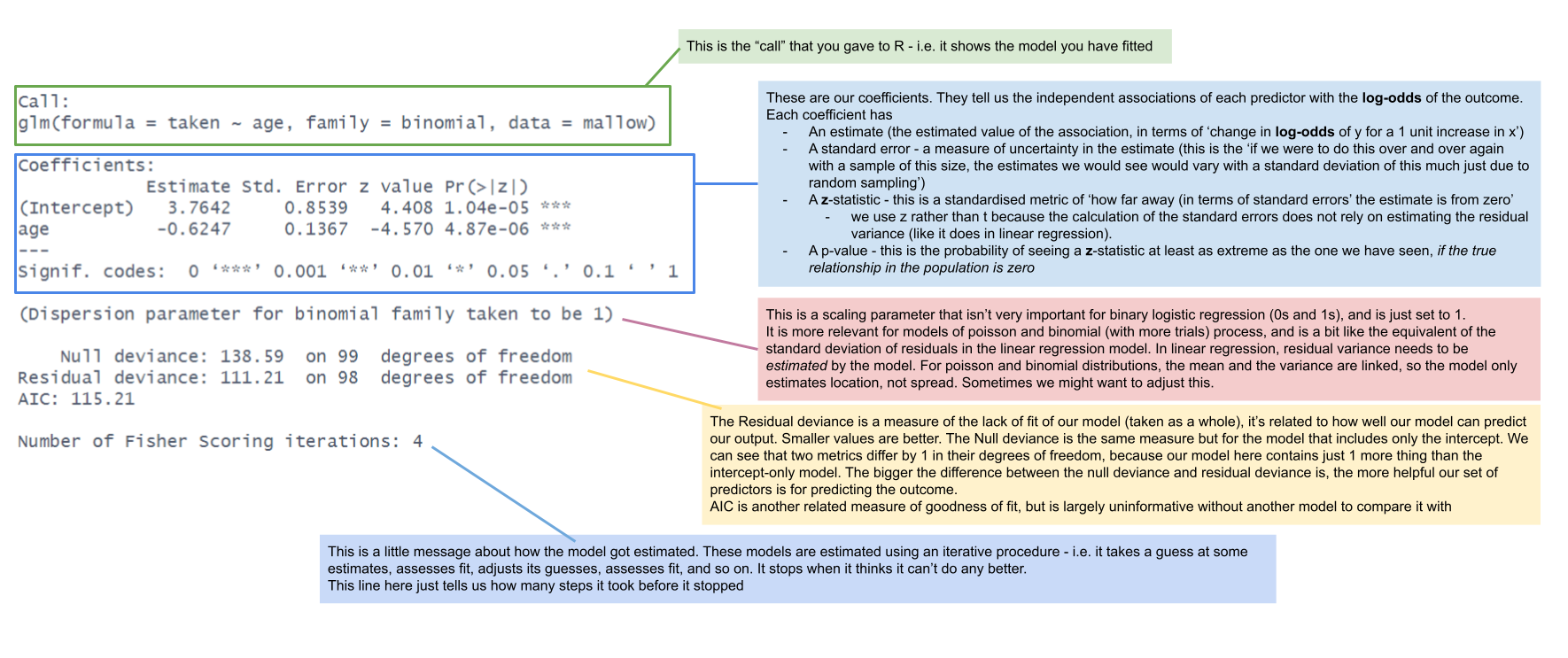 You might notice that the summary output of our logistic regression model has \(z\) statistics instead of \(t\) statistics. However, the logic of the tests remains just the same as it was for the linear model (and for all the tests we have done thus far) - it is a test against the null hypothesis that the coefficient is zero. Or, less formally, we can think of the corresponding p-value as “in the null universe where there is no relationship between \(x\) and the occurrence of event \(y\), there is a p-value chance of seeing a sample of this size with an association as strong as the one we have got”