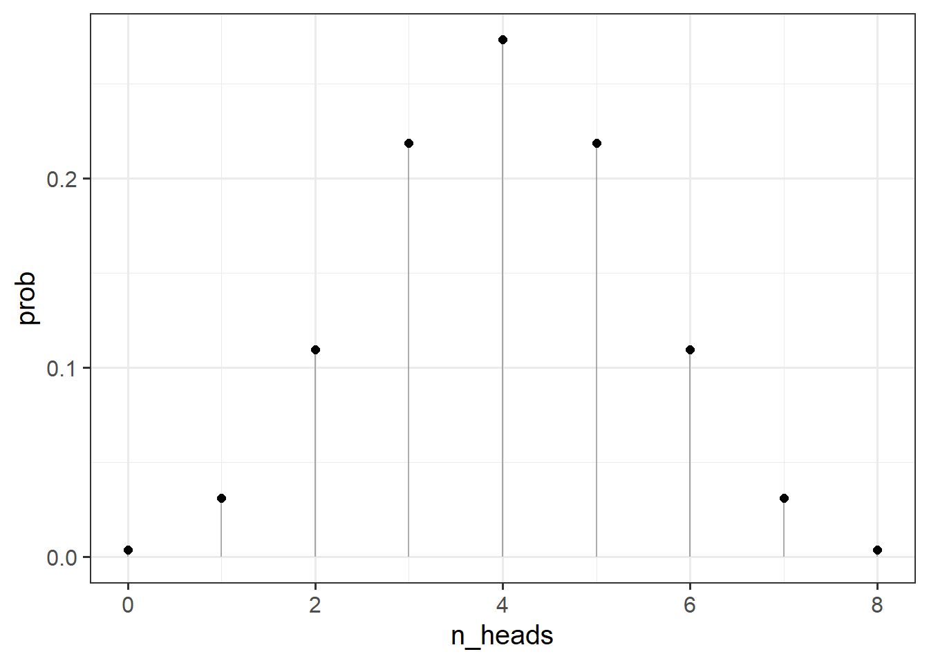 dbinom(0:8, 8, prob = 0.5)[1] 0.00390625 0.03125000 0.10937500 0.21875000 0.27343750 0.21875000 0.10937500