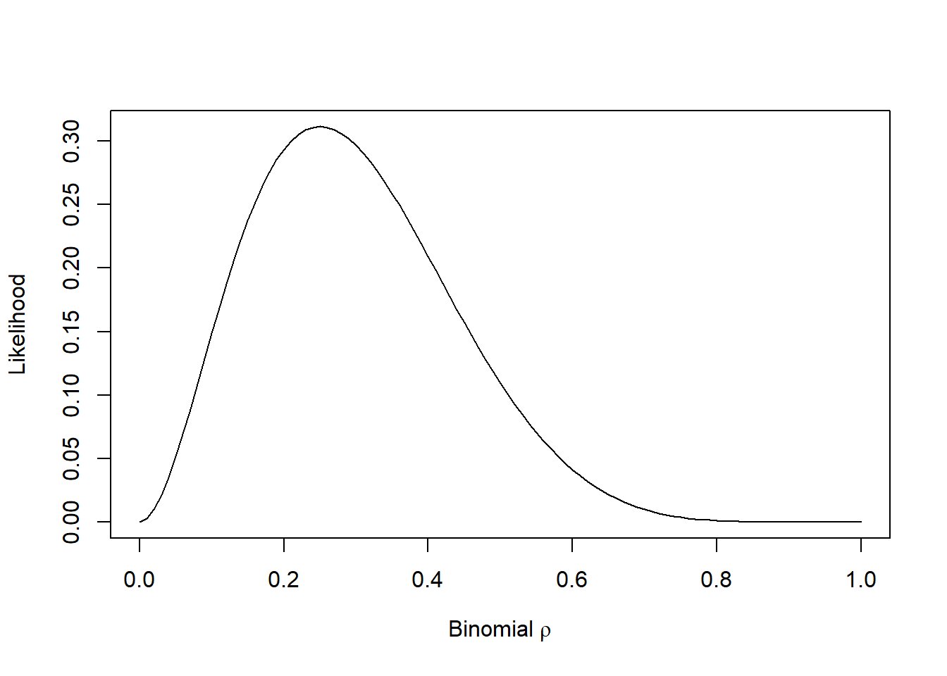 dbinom(2, 8, possible_parameters) [1] 0.000000e+00 5.145643e-02 1.488035e-01 2.376042e-01 2.936013e-01