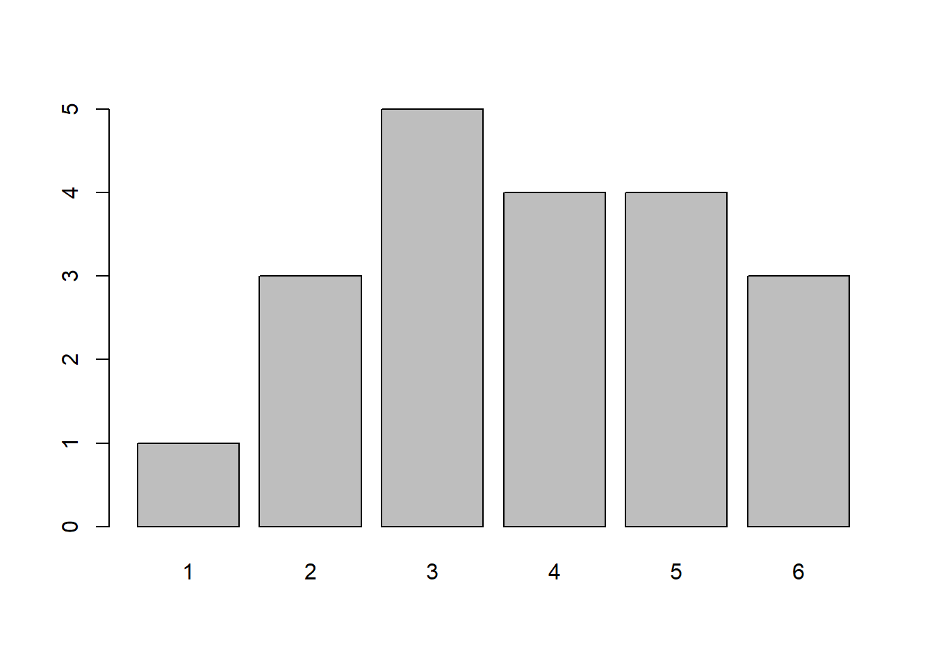 Create a barplot showing the frequency with which each number was landed on in the 20 rolls.