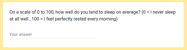 For these next exercises we are going to be focusing on self-perceived sleep quality ratings. Our survey contains a set of respondents who completed the question below. We’re going to use this sample to get an estimate of the sleep quality rating in the wider population.