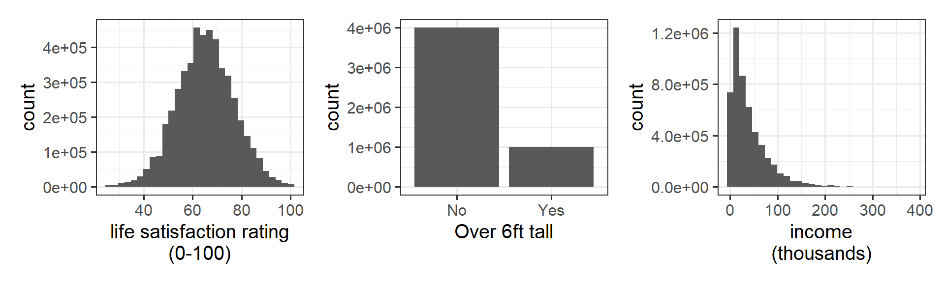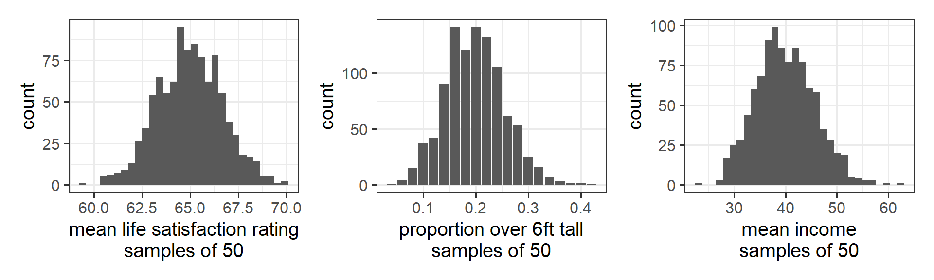 If we repeatedly collect samples of say, 50 people, and calculated the mean life satisfaction, the mean income, and the proportion >6 foot tall for each sample of 50, then the distribution of those sample statistics will be normal (Figure 11). This is known known as the “central limit theorem”.
