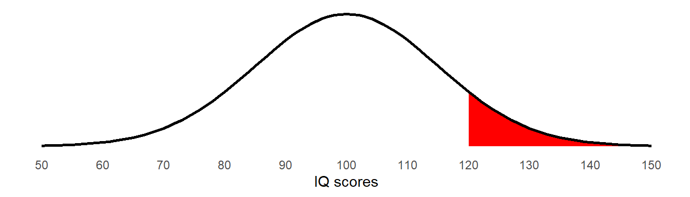 What we’re asking here is for the amount of the normal distribution with mean = 100, sd = 15 that falls beyond 120 (Figure 3). Note that the distribution we’re talking about here is an abstract one that represents all the possible IQ scores that we might observe if we were to randomly sample the population.