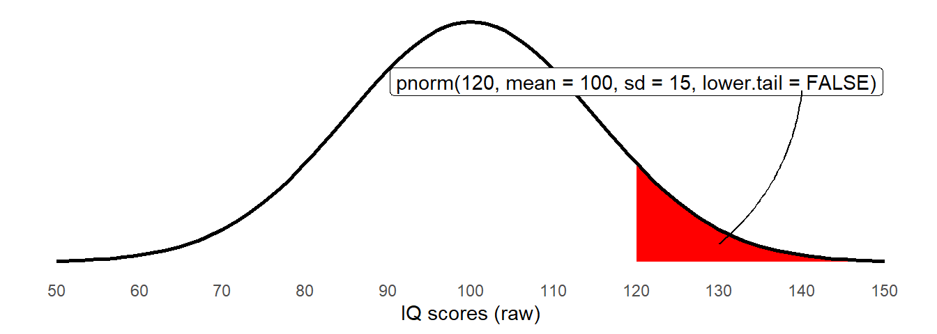 pnorm(120, mean = 100, sd = 15, lower.tail = FALSE)[1] 0.09121122