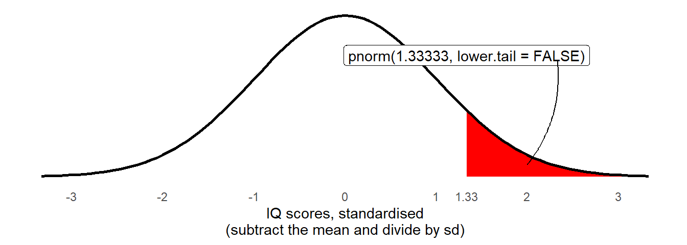 Note that if we translate our “IQ >120” to being in terms of standard deviations - \(\frac{120 - 100}{15} = 1\frac{1}{3}\) - then we can perform the same computations as we have done above, but comparing against against a normal distribution with mean of 0 and standard deviation of 1 (which are the defaults for the pnorm() function):