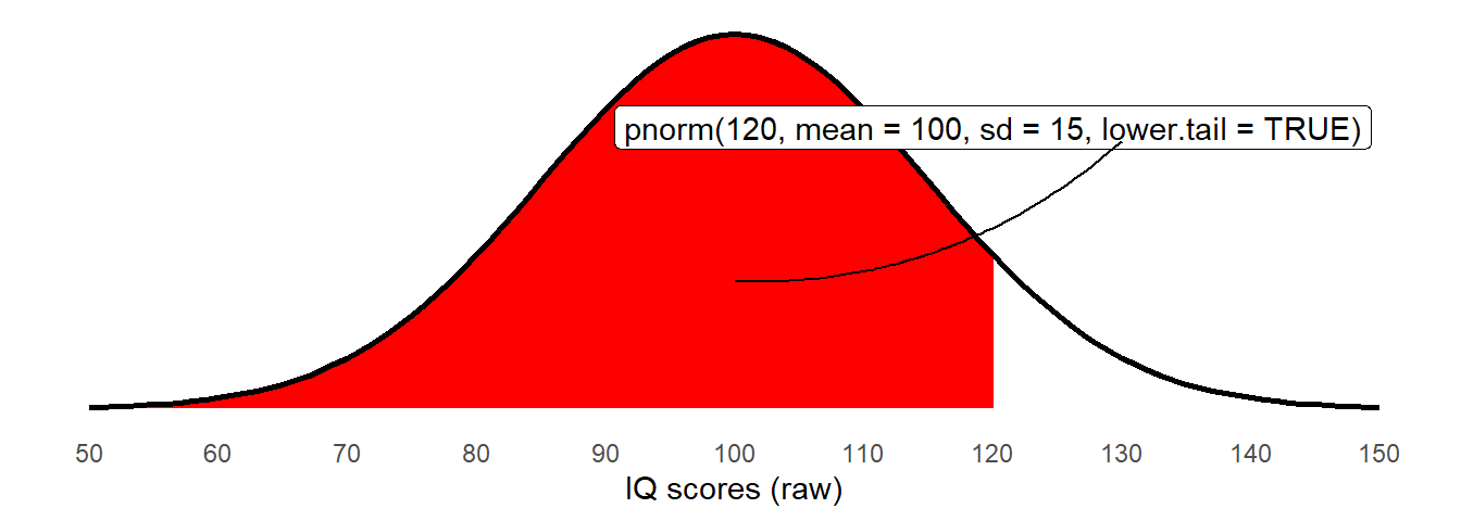 pnorm(120, mean = 100, sd = 15, lower.tail = TRUE)[1] 0.9087888