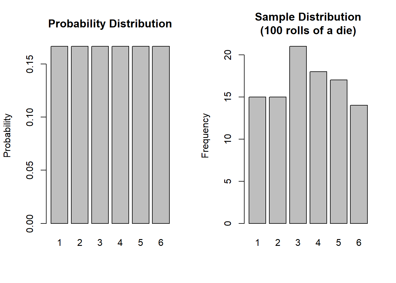 For example, the function that governs the behaviour of rolling a single die is uniform in that each possible response has an equal probability (\(\frac{1}{6}\)) of being observed (below left). When we collect data by actually rolling a die 100 times, we will observe a sample distribution (below right).