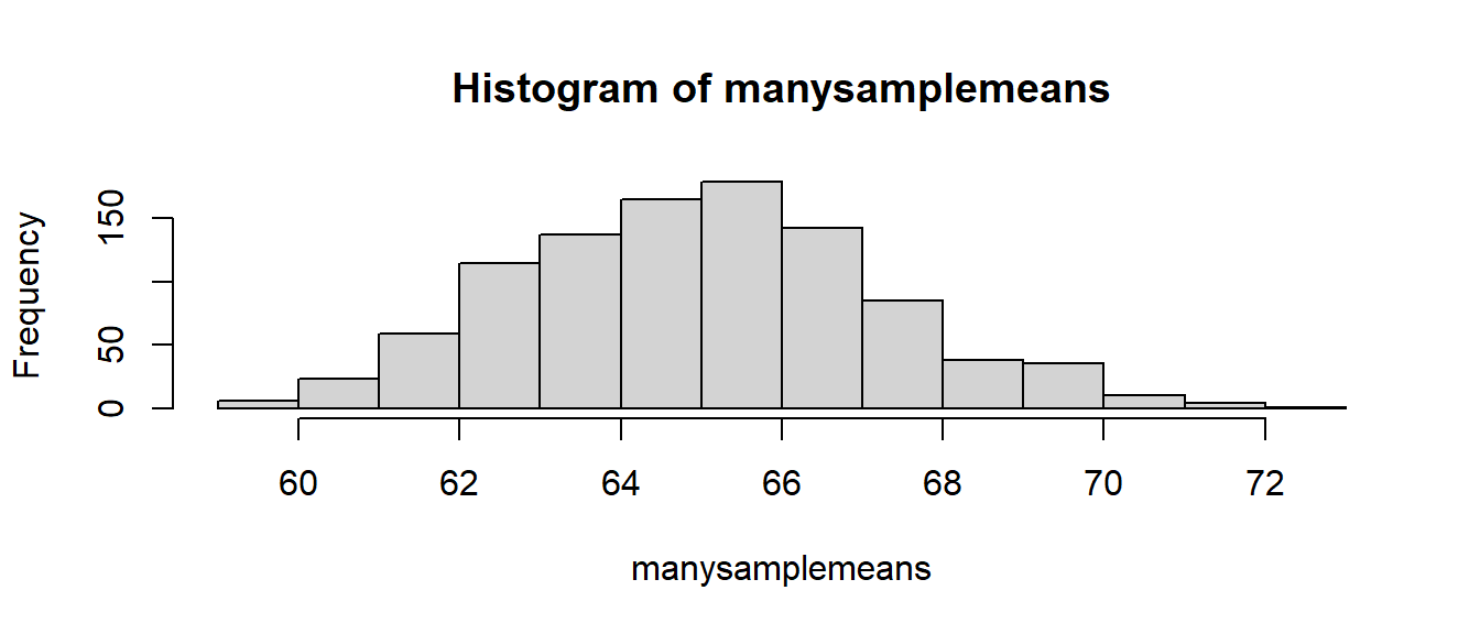 manysamplemeans <- replicate(1000, mean(rnorm(n = 30, mean = 65, sd = 12)))
