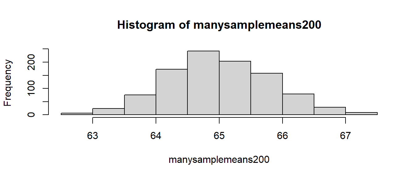 manysamplemeans200 <- replicate(1000, mean(rnorm(n = 200, mean = 65, sd = 12)))