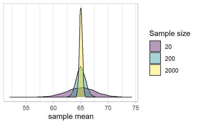 We can see that an estimate from a sample of 200 is more precise - rather than being between 60 and 72, most of the distribution is now between 63 and 67. So our estimate from a sample of 200 has a greater chance of being closer to the true population value than an estimate from a sample of 30.