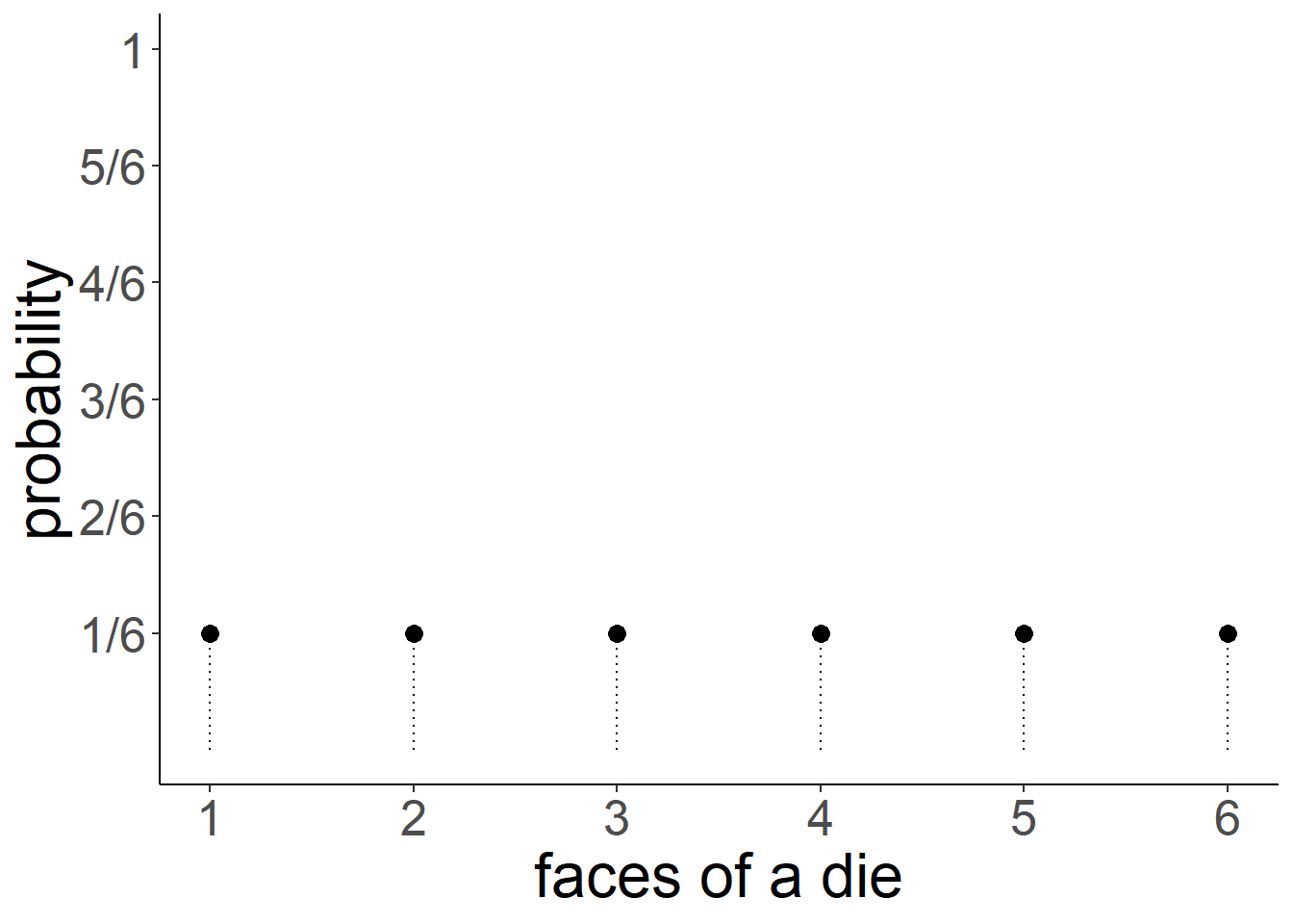 For a fair 6-sided die, the probability of the die landing on each side is 1/6, and the probabilities of all the possible responses sum to 1 (because it has to land on one of the sides).