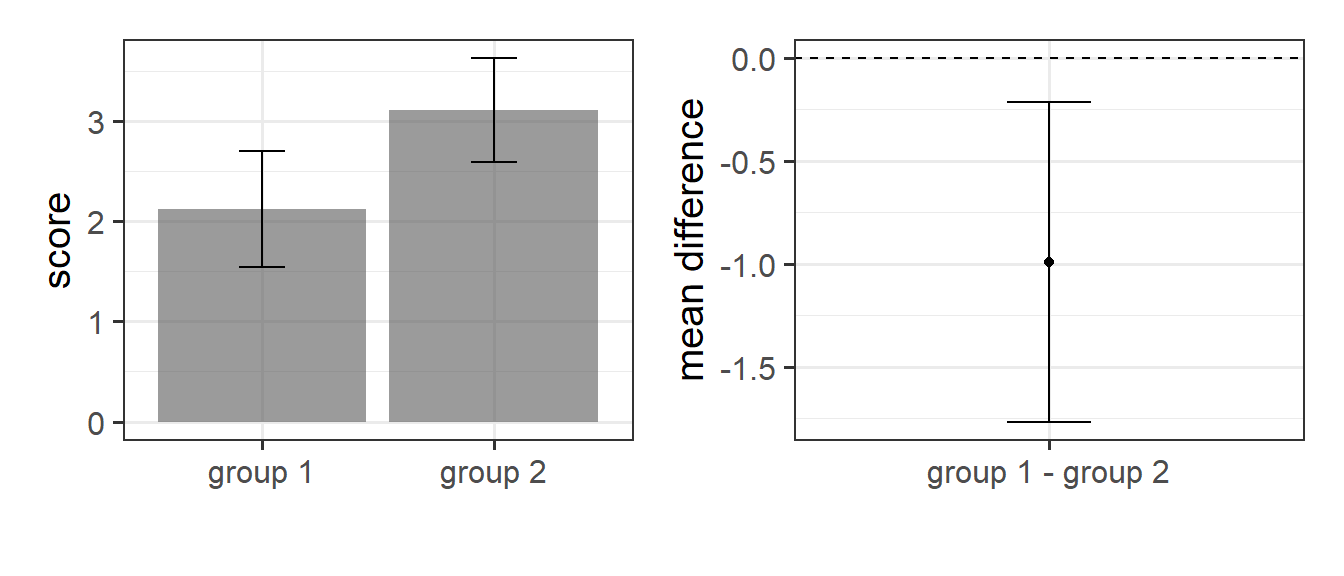 - Overlapping confidence intervals do not necessarily indicate “no difference”. Lots of people will see a figure such as the left-hand one below, and conclude that there is no difference. However, the sampling variability for a single mean is not the same as the sampling variability for a difference in means, and so despite the overlap, when we “test” for a difference we may well find one (the right hand plot makes it look like there is a difference).