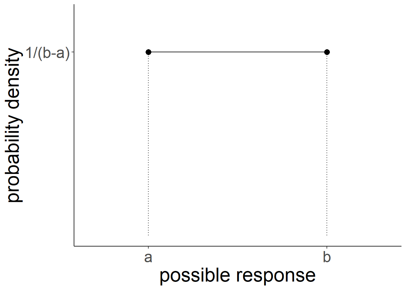 However, the uniform probability distribution can be relevant for a continuous numeric variable as well (e.g. something which as well as taking the values 4 and 5 can also take 4.1, 4.11, 4.1111111111, 4.764968473 etc.. - they can take any real value). We can preserve the idea that probability sums to 1 for this sort of variable by having the probability as \(\frac{1}{b-a}\), where \(a\) and \(b\) are the lower and upper bounds of the response domain. Why? Because this makes the area of the distribution equal to 1 (area of a rectangle = width \(\times\) height. \((b-a) \times \frac{1}{(b-a)} = \frac{b-a}{b-a} = 1)\). This means we can compute areas of parts of the distribution in order to calculate probabilities!