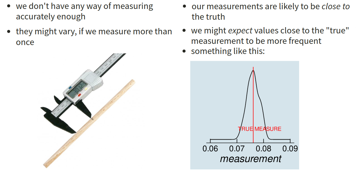 We can motivate the relevance of the normal distribution in various ways. For instance, when we take a measurement of something such as the length of a stick, then we always have a bit of imprecision - our measurements will vary a bit. Assuming that our measurement tool is unbiased and this imprecision is purely random, we would expect the measurements of the stick to be ‘normally distributed’ around the true length of the stick (Figure 8).