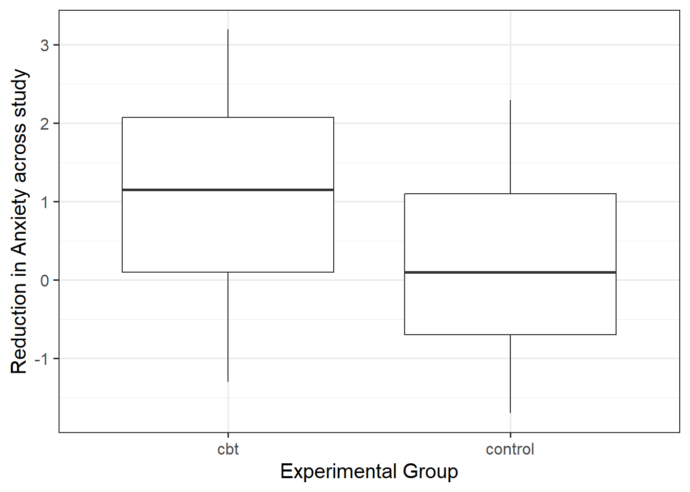 Data are at https://uoepsy.github.io/data/cbtanx.csv. The dataset contains information on each person in an organisation, recording their professional role (management vs employee), whether they are allocated into the CBT programme or not (control vs cbt), and scores on anxiety at both the start and the end of the study period.