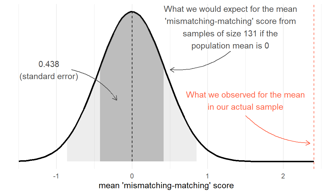 What we’re really interested in talking about is the average ‘mismatching - matching’ score for everybody, not just our sample of 131. But we only have those 131 people, so we’ll have to make do and use their data to provide us with an estimate.