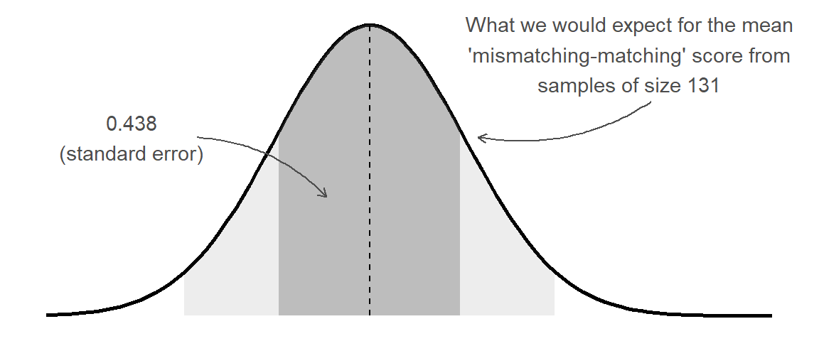 This enables us to, for instance, construct a range of plausible values for our estimated ‘mismatching - matching’ score. The range is centered around our point estimate (the mean score in our sample), and we widen it to include X% of the possible means we might also see from a sample of the same size. This is achieved by multiplying the standard error by a value that corresponds to our confidence level.