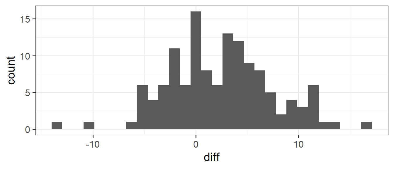 What we’re interested in is the distribution of these difference-scores. Are people, on average, slower? This would correspond to a positive value of the diff variable. Let’s get some summary statistics and a visualisation of out observed distribution.