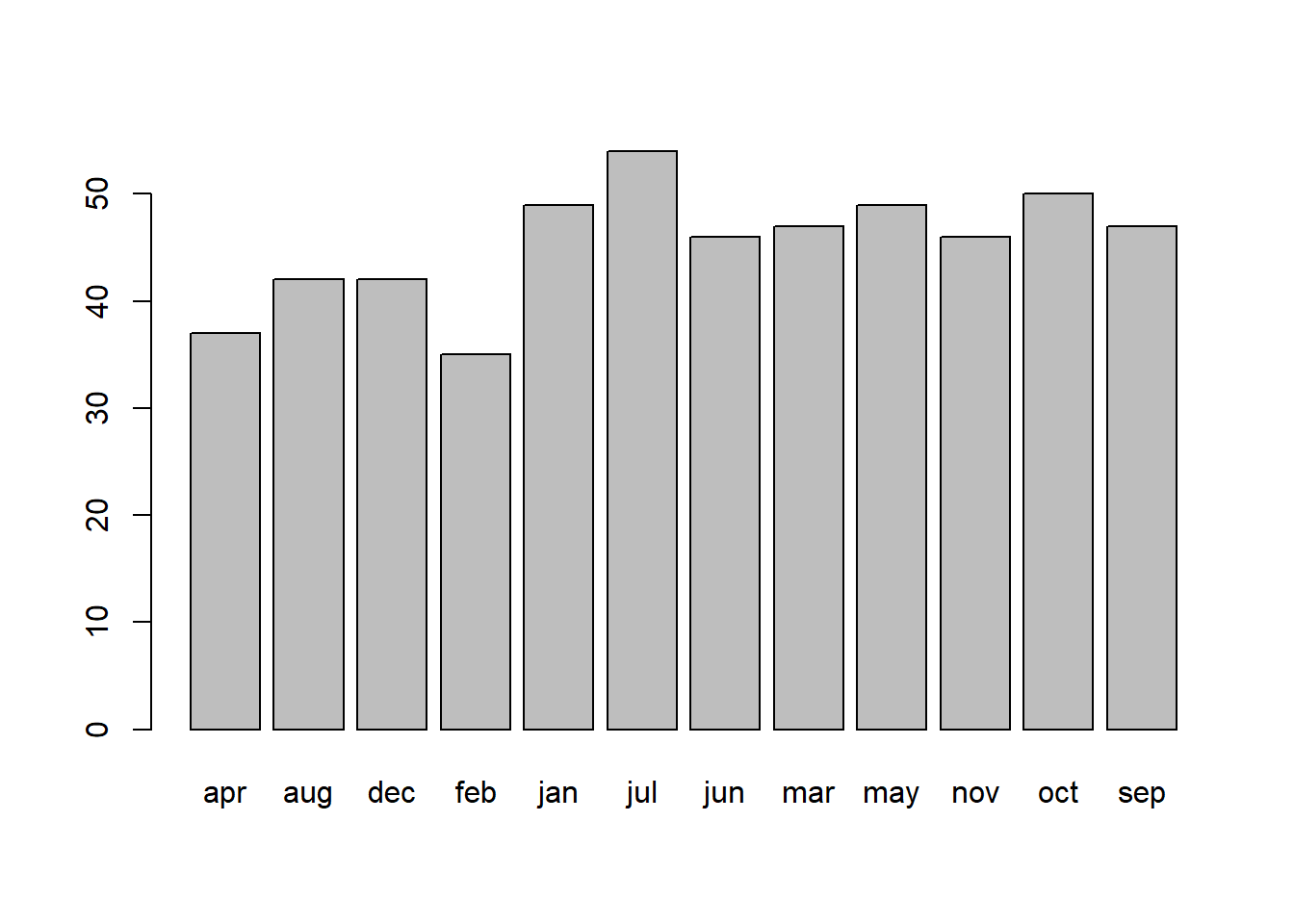 chisq.test(table(surveydata$birthmonth))(thetablefunction will ignore NAs by default, so we don’t need to do anything extra for this).