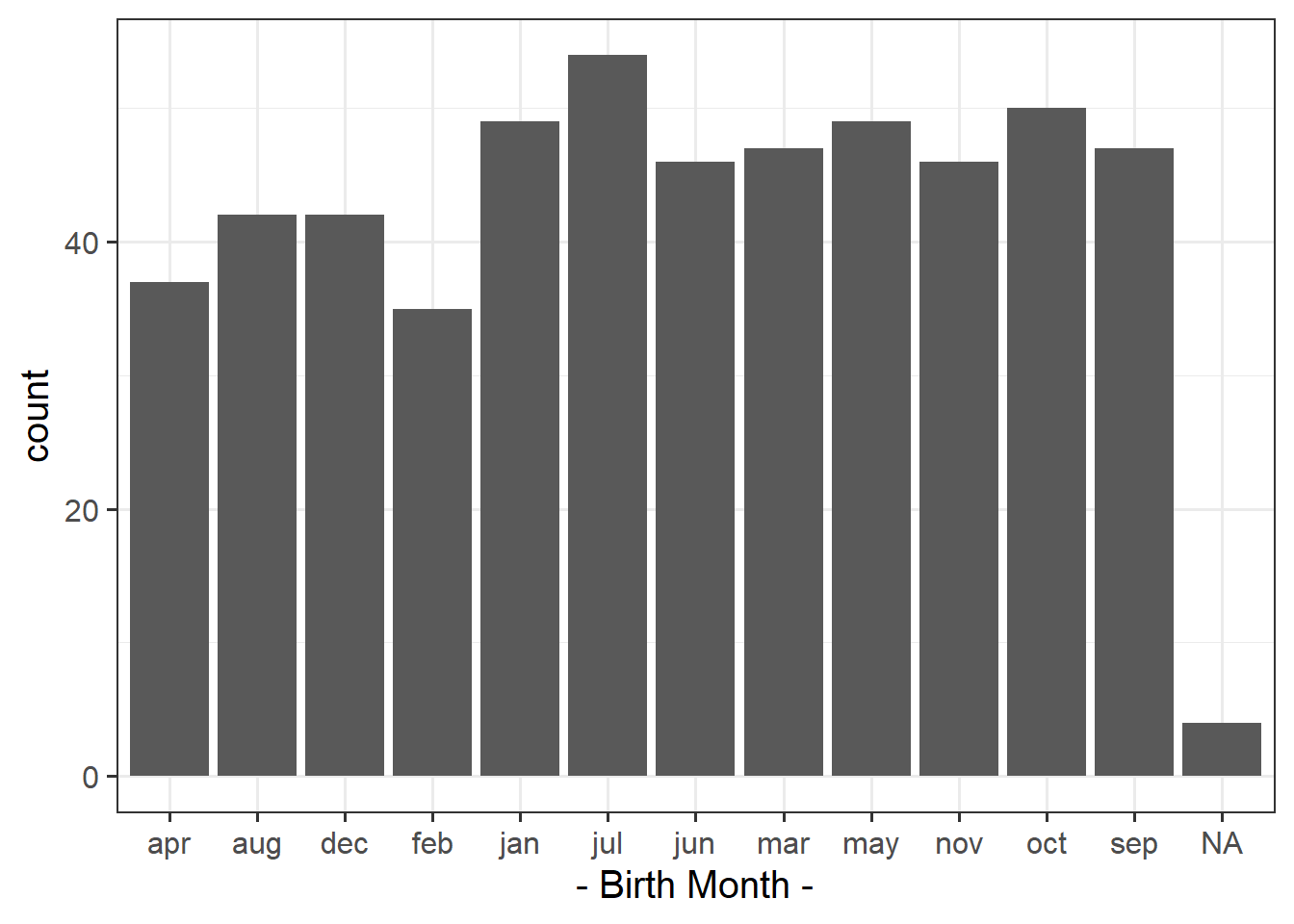 The code below creates counts for each month. Before doing that, it removes the rows which have an NA in them for birthmonth: