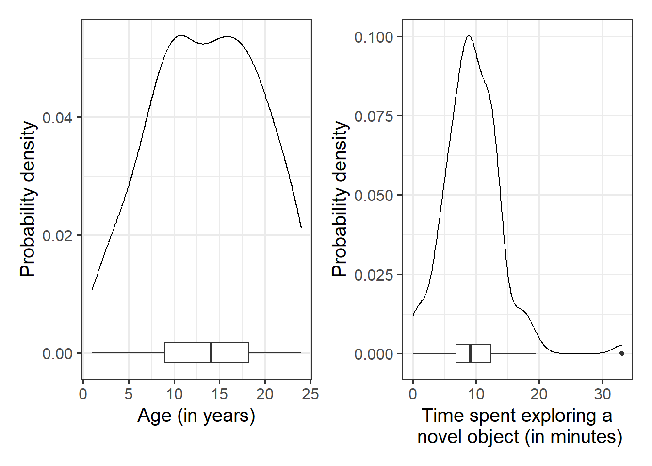 library(patchwork)# the patchwork library allows us to combine plots togetherggplot(data = monkeyexp, aes(x = age)) +geom_density() +geom_boxplot(width =1/300) +labs(x ="Age (in years)", y ="Probability density") +ggplot(data = monkeyexp, aes(x = exploration_time)) +geom_density() +geom_boxplot(width =1/175) +labs(x ="Time spent exploring a\n novel object (in minutes)", y ="Probability density")
