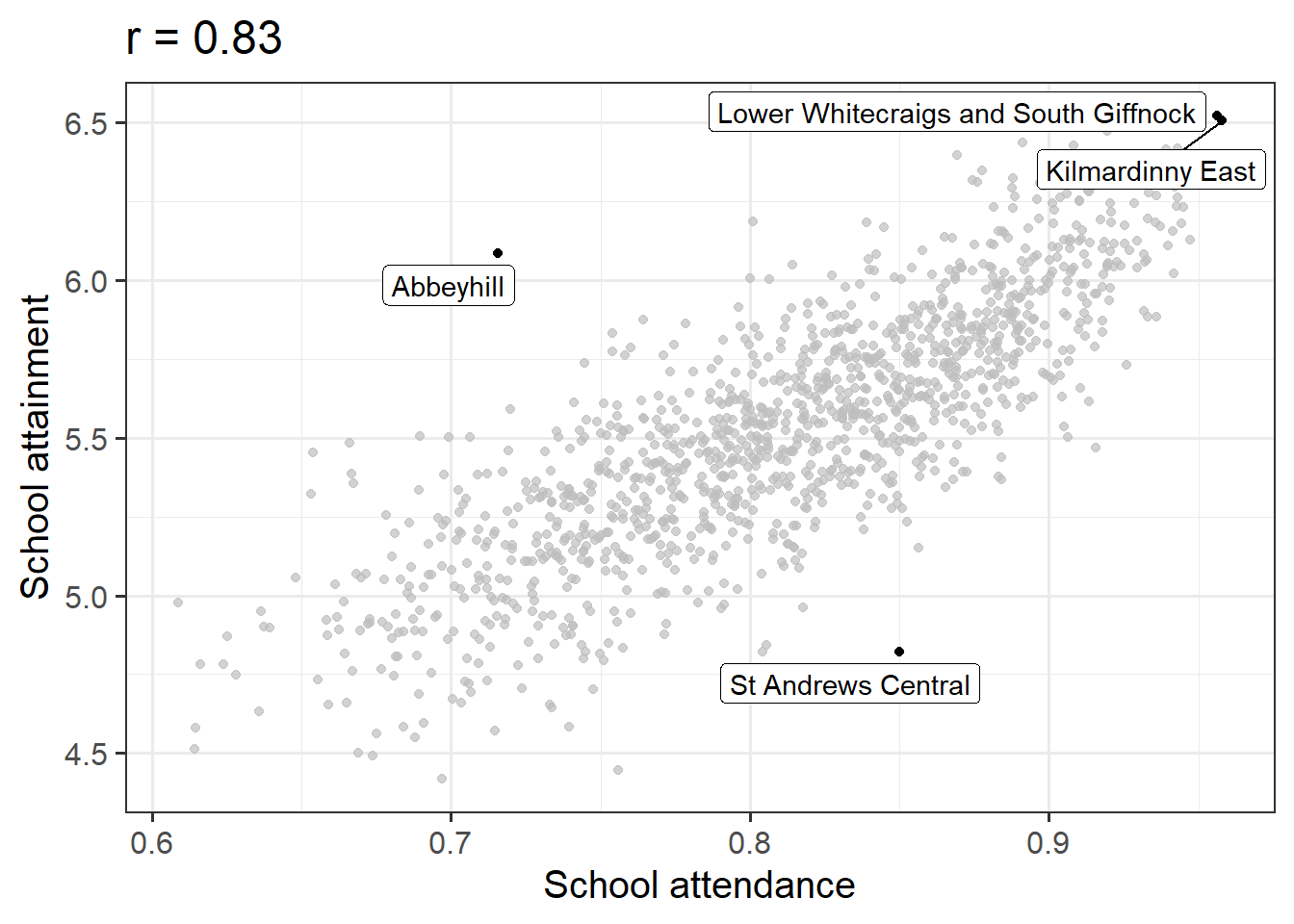A correlation test was conducted to assess whether there is a relationship between an area’s average school attendance, and its average school attainment level. A total of 1244 geographical areas were included in the analysis, with a mean school attendance of 0.81 (SD = 0.07) and a mean school attainment score of 5.53 (SD = 0.39).