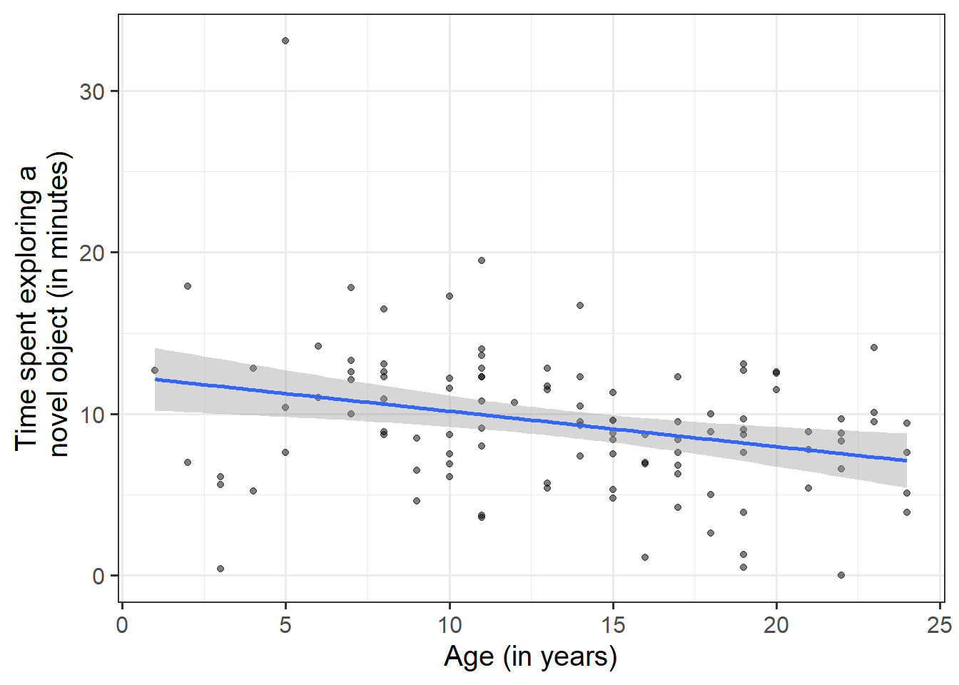 ggplot(data = monkeyexp, aes(x = age, y = exploration_time)) +geom_point(alpha =0.5) +geom_smooth(method=lm) +labs(x ="Age (in years)", y ="Time spent exploring a\n novel object (in minutes)")