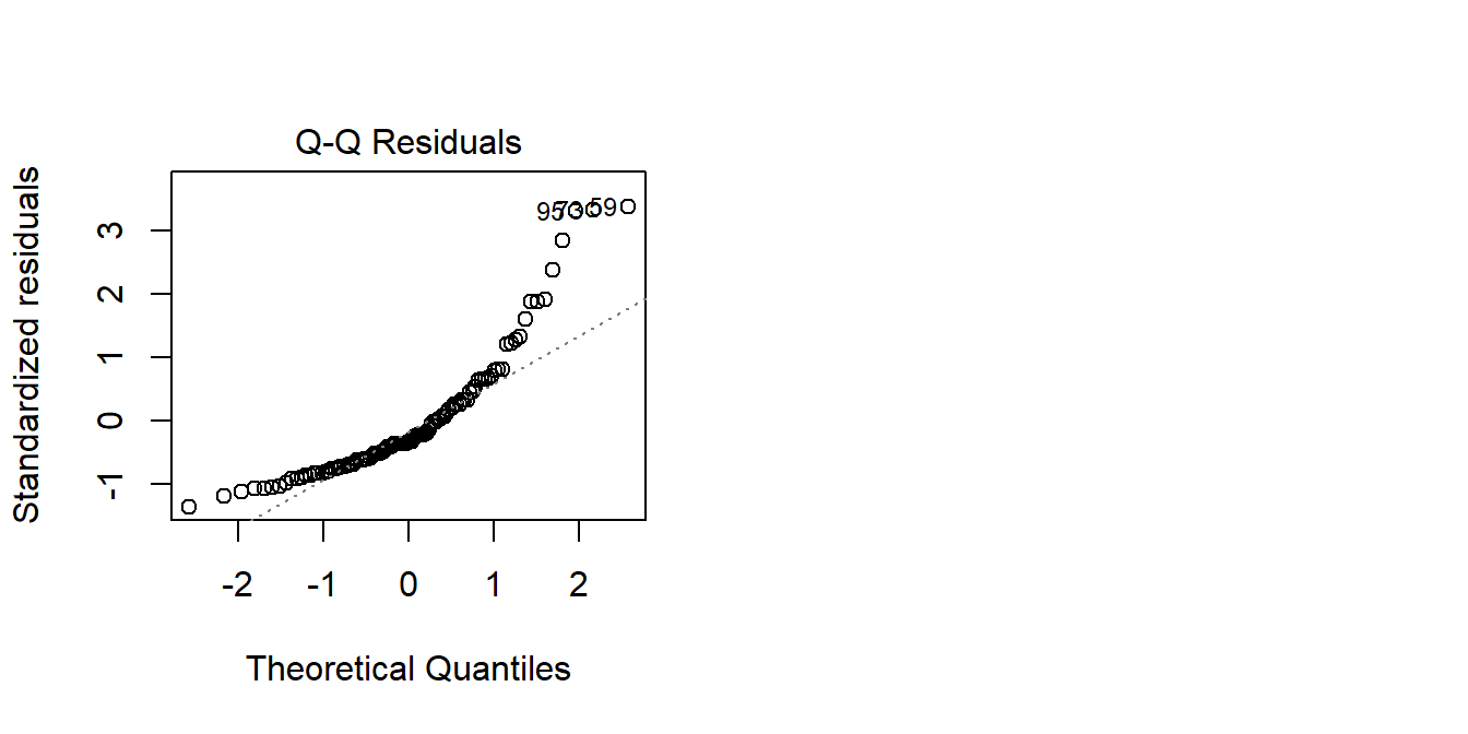 Model residuals showed slight deviation from normality (see QQplot), but this was not deemed problematic as the Shapiro-Wilk test failed to reject the null hypothesis that the residuals were drawn from a normally distributed population (\(W = 0.98\), \(p = 0.62\))