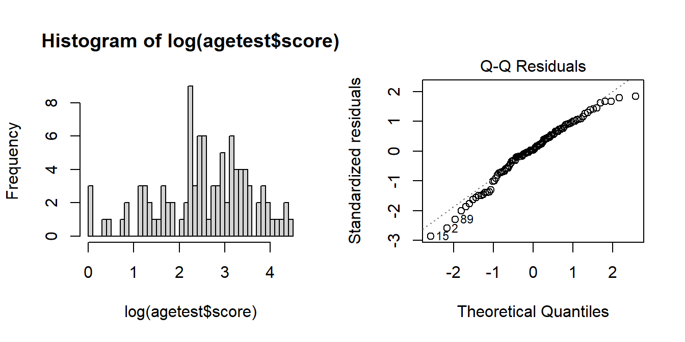 The resulting distribution of transformed scores is closer to normally distributed, and the residuals of modelling lm(log(score) ~ age) looking less problematic: