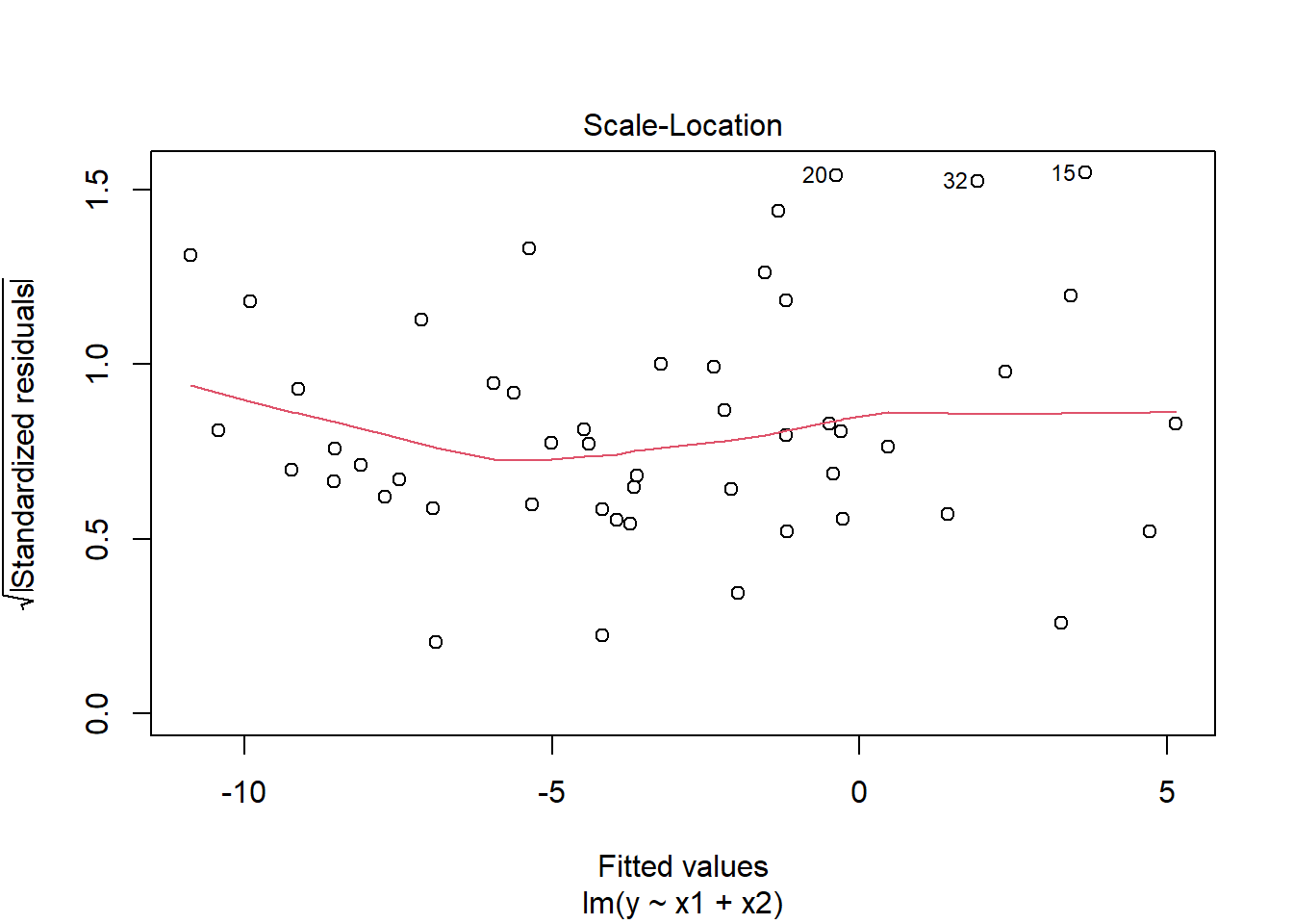 If needed, we can extract specific plots using, for instance: plot(model, which = 3) for the third plot.