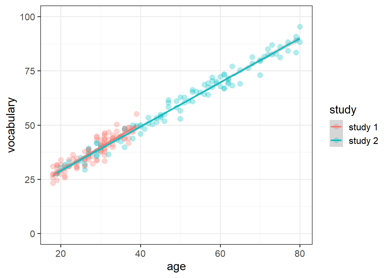 As a toy example, I have two datasets, each of 100 people. The first has people aged 18 to 40. The second has people aged 18 to 80. Both datasets have been taken from a population where the underlying linear relationship between age and vocabulary is \(vocab_i = 10 + 1 \cdot age_i\). So the “association between age and vocabulary” should be more or less the same for both datasets (as seen in Figure 4).
