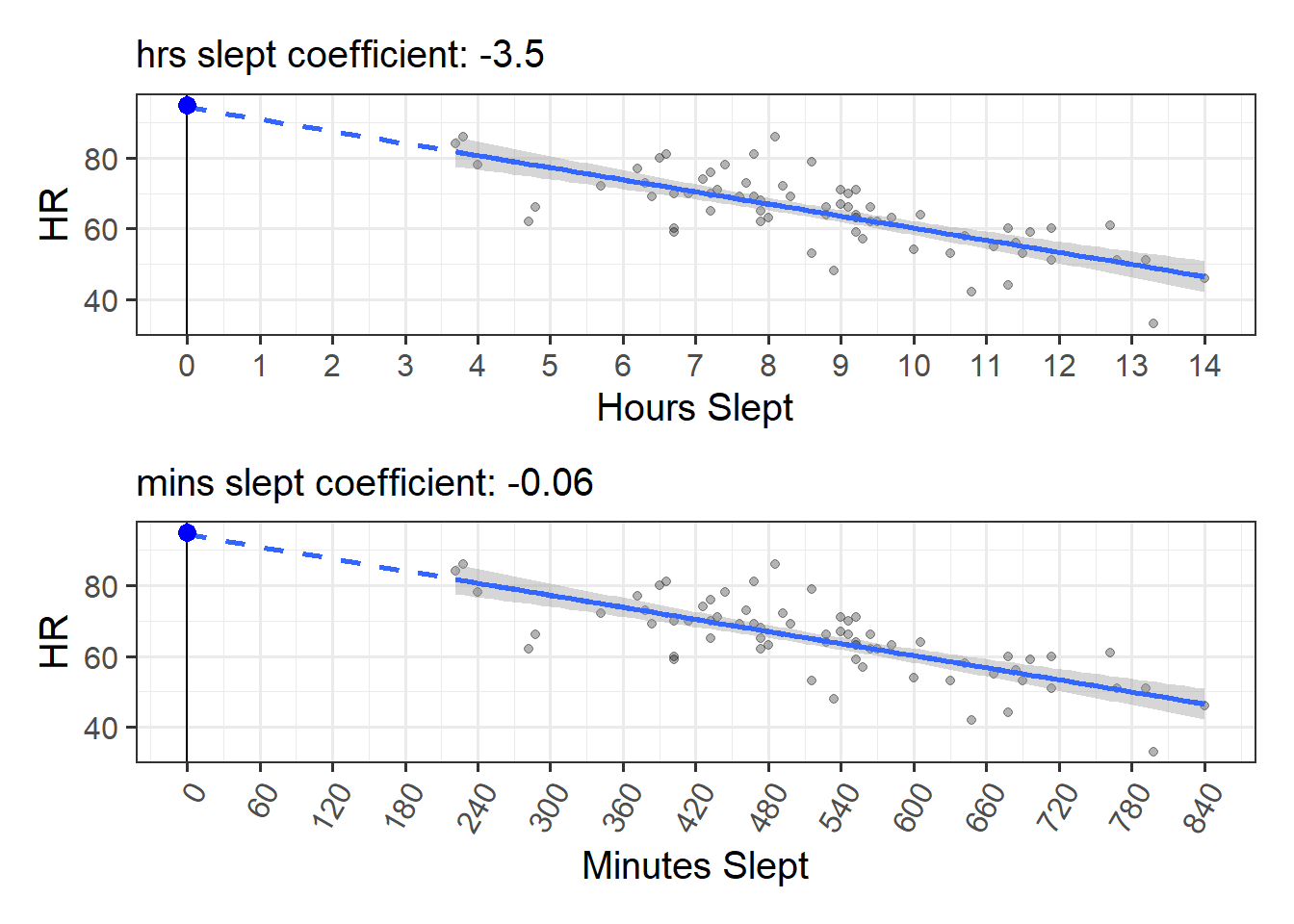 but we can actually do that calculation ourselves, because 1 minute is 1/60th of an hour. So we already know that \(\frac{\text{change in HR for every 1 hour of sleep}}{60}\) is the same thing as “change in HR for every 1 minute of sleep”.