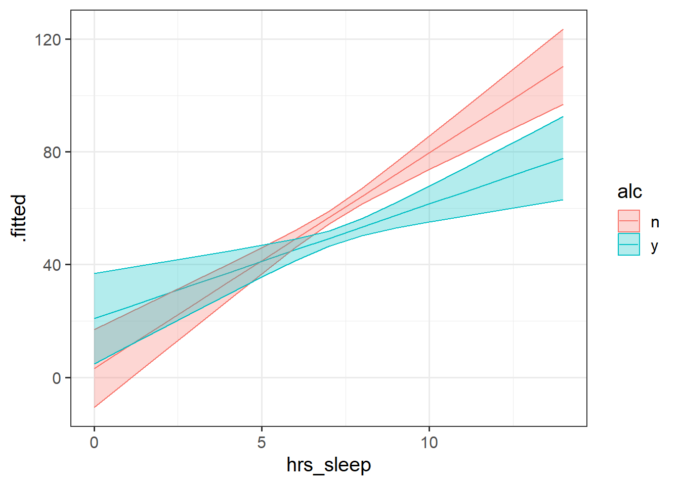 Our interaction involves a continuous variable (hrs_sleep) and a binary variable (alc). An interpretation of a similar example is in 9A #interpretation.